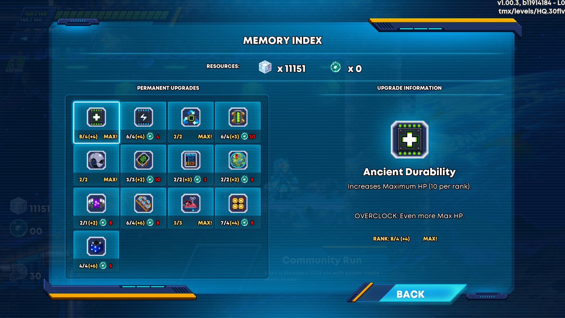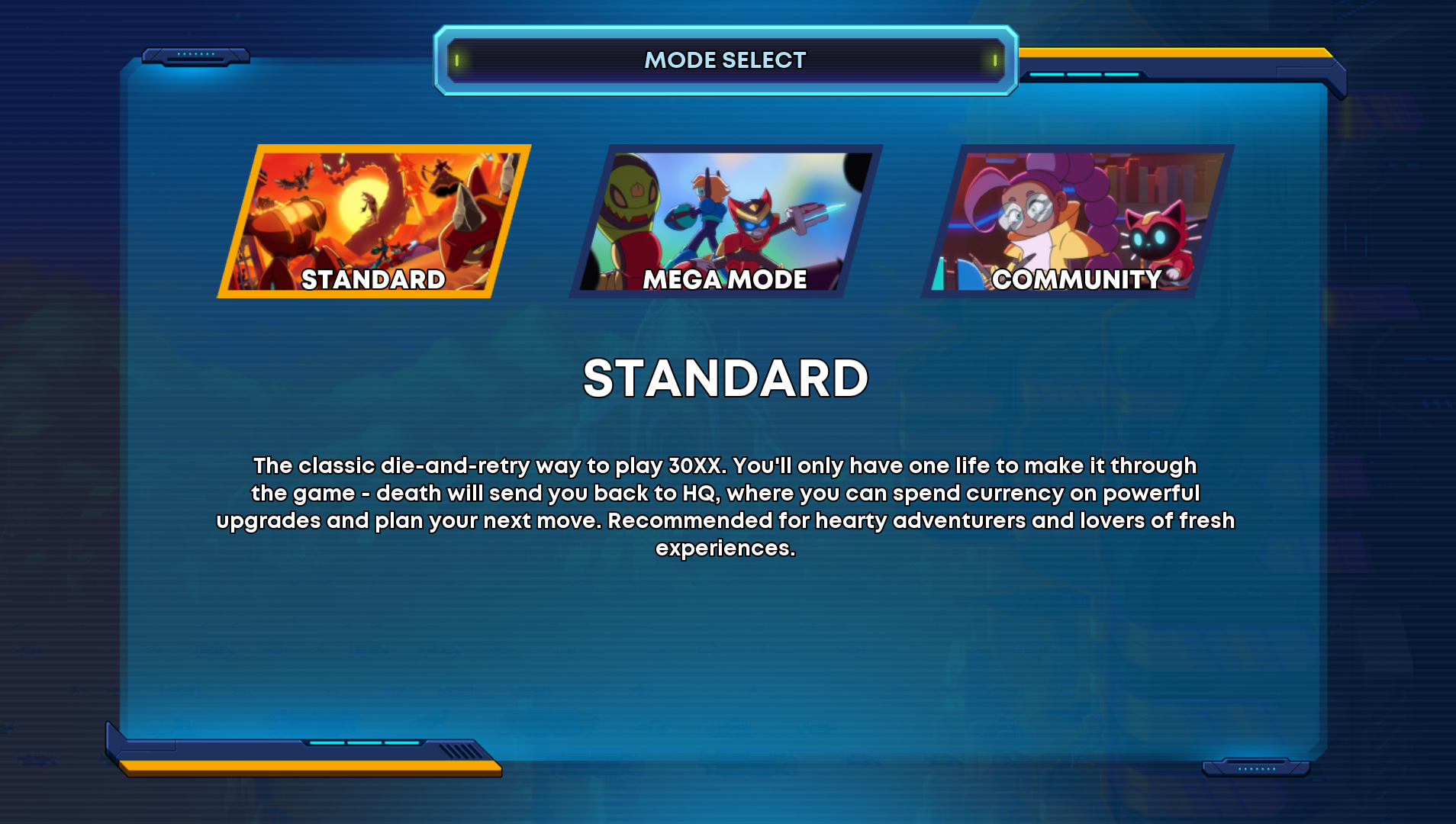 There are three main game modes in 30XX: Standard Mode, Mega Mode, and Community Mode.
