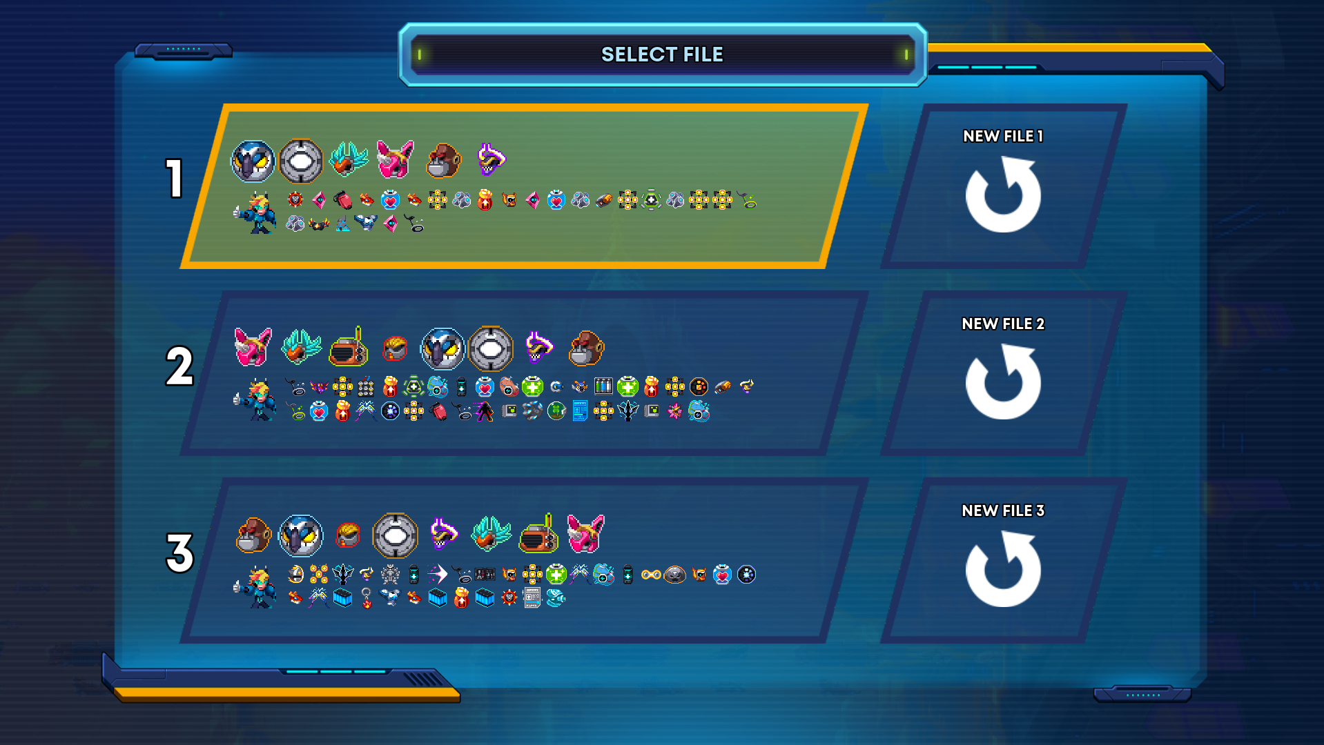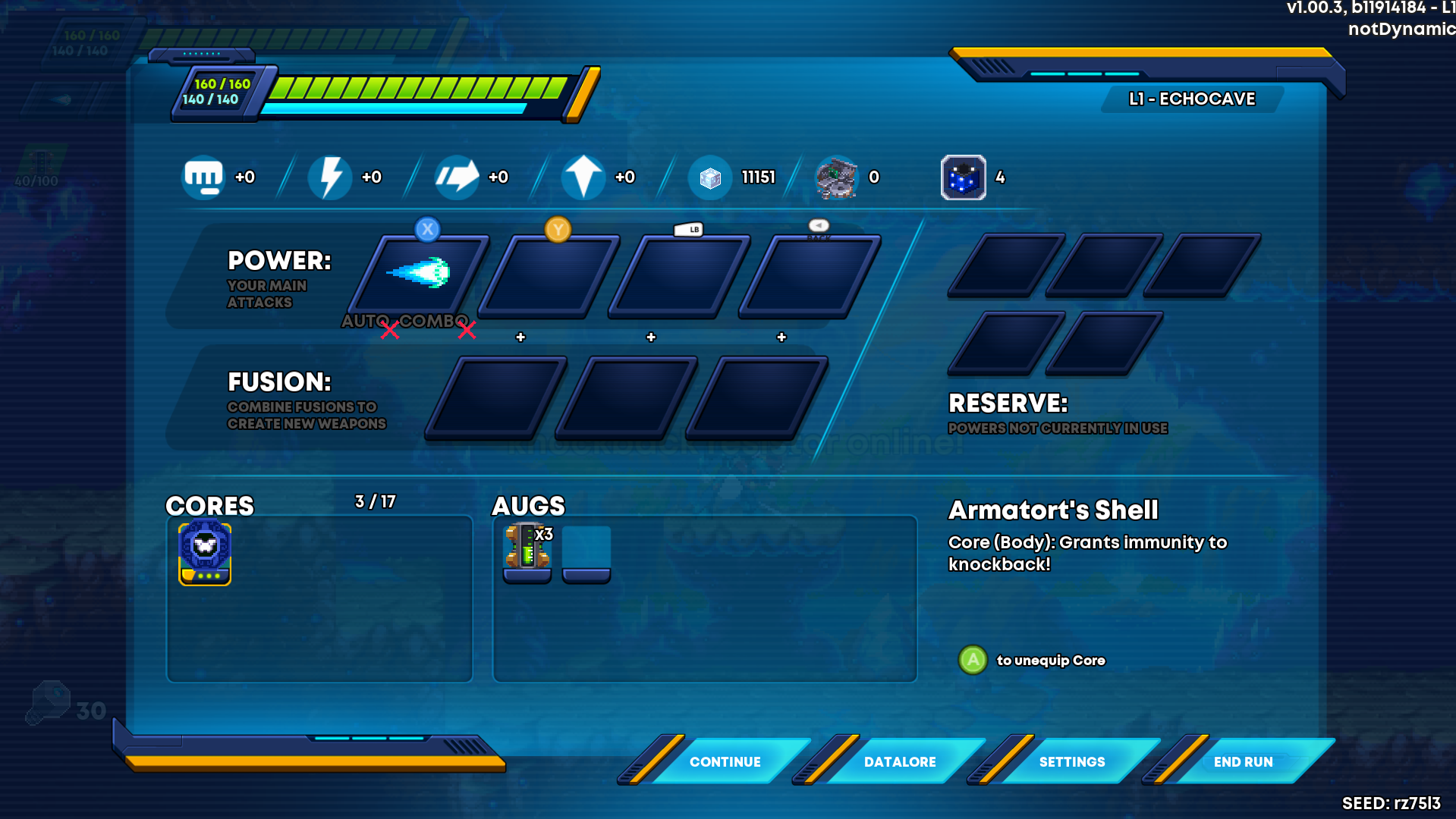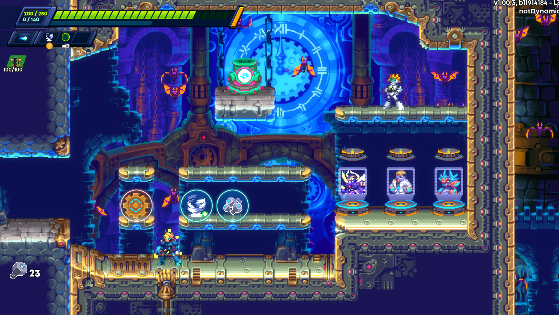 Another thing these chests can drop is Cores. Think of these are armor pieces from the Mega Man X series, but there are a lot of them. There is a set that focuses on giving you multiples, such as charge shots or double jumps, another focused on air dashing, dashing with a shield, or dashing and firing a blast, and one dedicated to empowering your repros (more on that in a second), another that can cause hovering/flight and life-stealing, etc.
