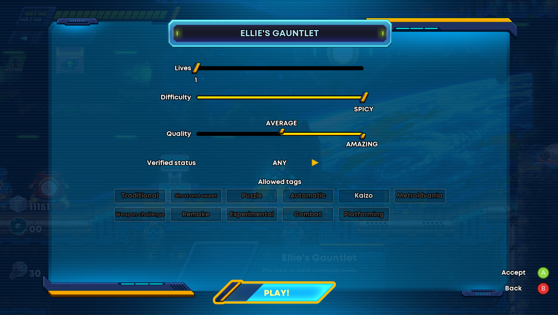 You can browse the level catalog and tackle them one at a time or start a run and even customize it by choosing how many lives you have, the difficulty of the level, and the quality of the levels based on used ratings. You can even select tags such as Traditional, Short and Sweet, Puzzle, Kaizo, Metroidvania, Weapon Challenges, Remakes, Experimental, Automatic, Combat, and Platforming to filter the kind of run you want to have. My recommendation is 1 Life, Spicy Difficulty, Amazing Quality, and just the Kaizo tag. Trust me, it’ll be fun for the whole family!