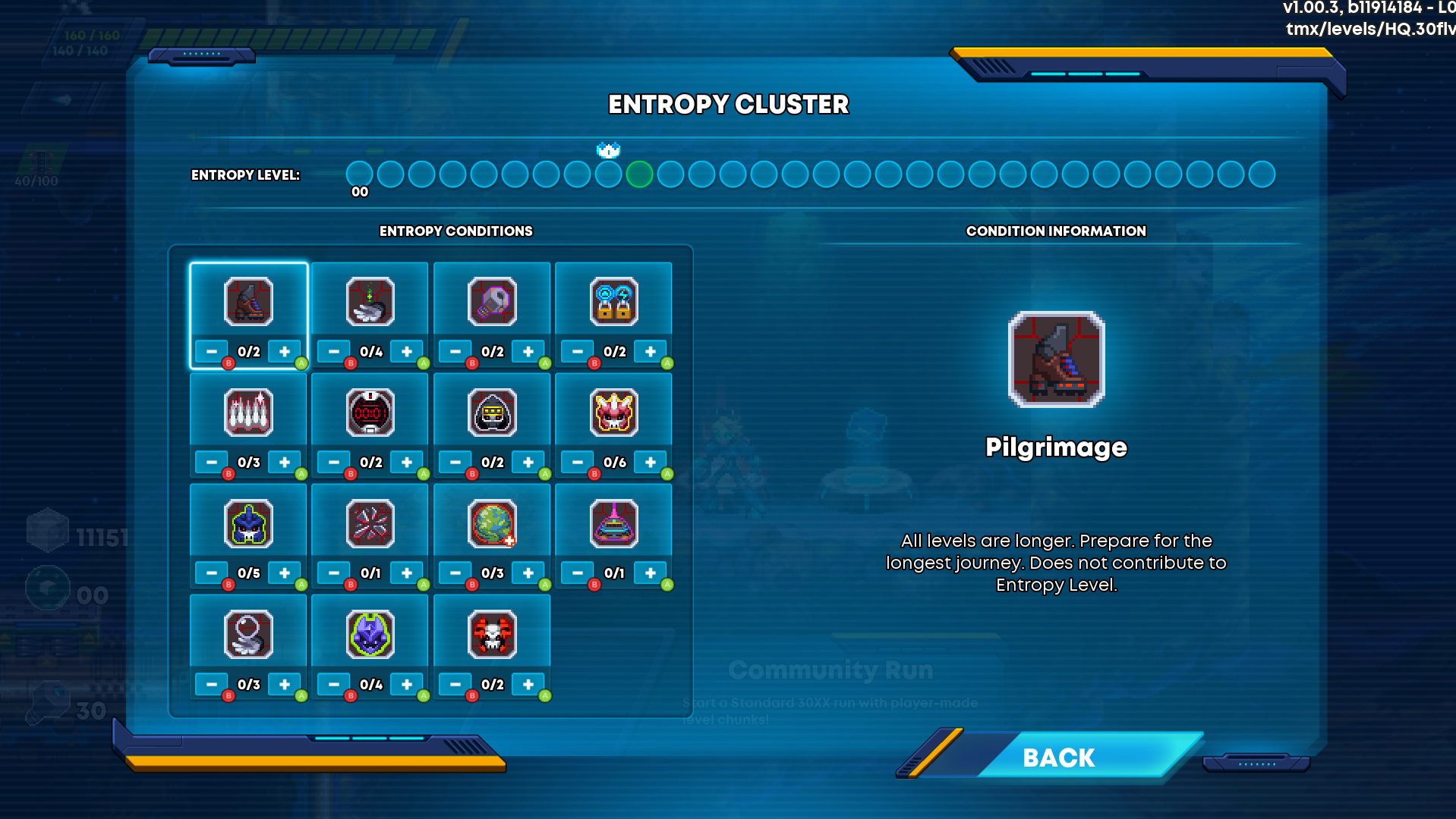 Entropy goes hand-in-hand with this system. Entropy increases the difficulty of the run, but you can control that difficulty. You can make enemies faster, have more health, do more damage, make spikes and pits lethal, make the stages longer, make enemies retaliate when slain, make healing do nothing, give enemies a chance to spawn as their higher-level versions earlier on, etc.
