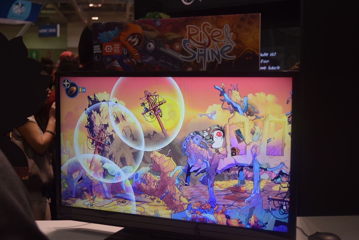 During PAX East 2015, we got a chance to check out Adult Swim Games and Super Awesome Hyper Dimensional Mega Team’s 2D side scroller, Rise & Shine. In Rise & Shine, you play as a young child named Rise who finds himself right smack in the middle of an invasion. Thankfully he gets the assistance of a wise cracking, gun called, Shine.