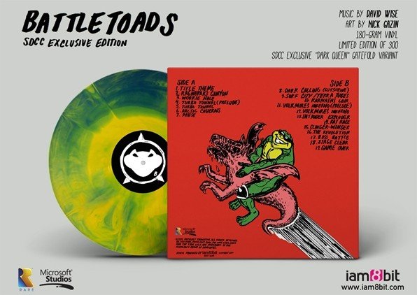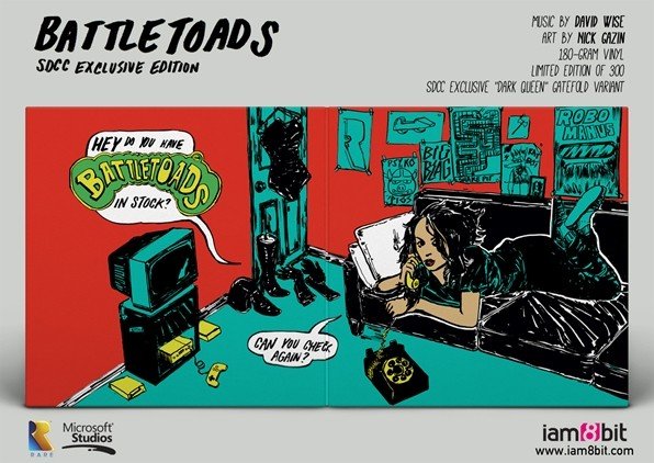 The second piece of exclusive merch is the Battletoads Vinyl Soundtrack, yep I said VINYL! This album inclues collections the Battletoads original soundtrack plus an exclusive “Dark Queen” gatefold variant and “Sound Chip” jacket that can’t be found anywhere else. To top it off, the album also features art from Brooklyn native artists, Nick Gazin. This is also limited and only 300 copies of the soundtrack exist.