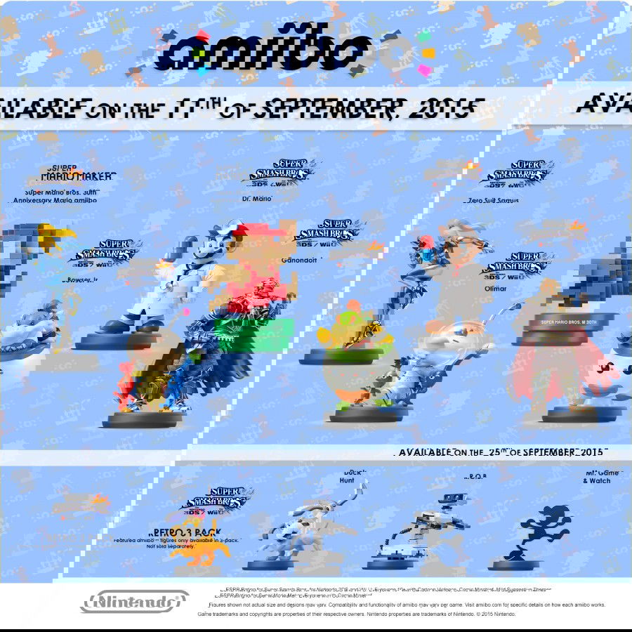 Further details about availability and pre-order schedules for these figures will be announced directly from various retailers in the near future. Three figures based on Mii Fighters, which were previously announced for release in September, will now launch as a 3 pack in November. More information about launch plans for the 30thAnniversary Mario Modern Color amiibo in North America will be shared in the future.