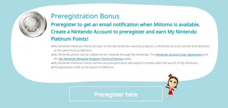 The app, called Miitomo, is described on the preregistration announcement page as “a free-to-start social experience that lets you spark conversations with your friends in a whole new way and uses Nintendo’s Mii characters.” In addition, creation of the new Nintendo Account system is available, and offers “My Nintendo Platinum Points” for preregistering as part of the new rewards program. You can preregister and learn more here.