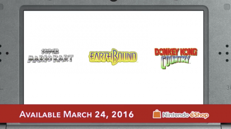 On the morning of March 24th, three classic SNES titles arrived to the North American Nintendo eShop. Earthbound, Super Mario Kart, and Donkey Kong Country join the rest of the SNES eShop library bringing the virtual console games up to 6 total. These new additions are sure to thrill many nostalgic gamers.