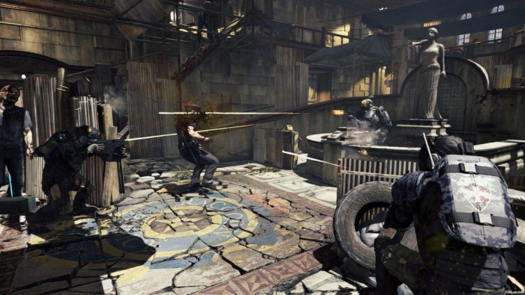 “The ruinous RPD building interior is reimagined as a patchwork refuge, with metal sheeting and scaffolding connecting the first and second floors. Mercenaries can even take cover beneath the ornate statue which held a key item in RE 2. Don’t get too nostalgic exploring the crumbling hall, however, because players are extremely exposed to enemy fire in this map.”
