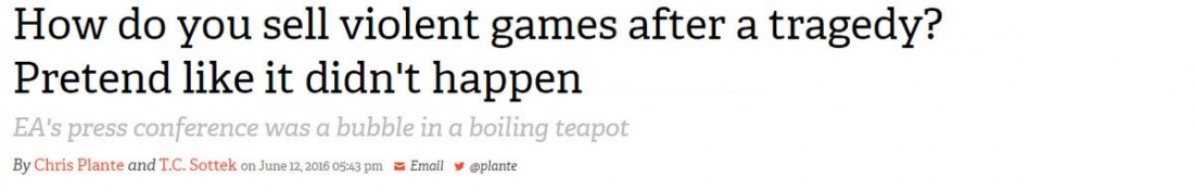 I don’t think it was EA’s intention to be silence on one of the biggest mass shootings in US history, but more that they didn’t know if such an audience, which was still probably coming to grips with the tragedy itself, was one they wanted to bring down with such a statement. E3 is meant to be a time of happiness and hype, bringing together the best of what gaming has to offer and just enjoying the hobby that it represents. Could you imagine what it would be like for an EA representative to come onto stage and announce that not only were they removing titles people were wanting from their E3 presentation, but we should take a moment to reflect on the lives lost? The event would be brought to a halt that no one on this planet could recover from. Now imagine that with every single publisher that is at E3 at the moment. There would be millions of dollars lost in promotion, floor space and many other areas if the company didn’t do what it did and kept going with the event.