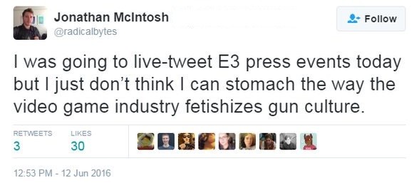 Well shit, if it isn’t Jon McIntosh, the mouthpiece behind Anita Sarkeesian (I bet you didn’t know he was involved in every piece of Feminist Frequency media huh?). He’s trashing video games again to score political brownie points. He was going to live tweet about E3 press conferences, probably how sexist things are as he gathers information to incorrectly use in the next “Tropes vs Video Games” series he… I mean Anita, will make sometime in the next 12 months. Now while I’ll concede a point that the video game industry does fetishize gun culture, I will state for the record that movies do the same thing. So do books, magazines, and just about every type of media when you take out context. But I will admit, it would be nice to see some games focus a bit more on the unfortunate side of gun violence… Oh wait, we did that in Max Payne years ago.