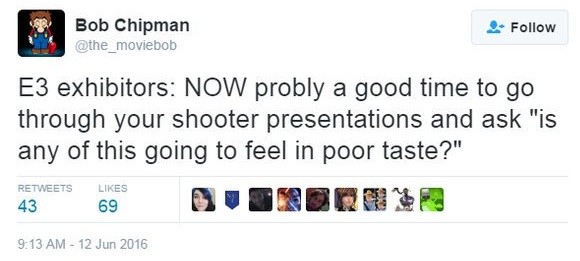 Now this double set of tweets from MovieBlob and one of his followers is one that annoys me. First off, Blob is expecting anyone with footage or gameplay of their games to go back through it and censor it for the sake of those poor people who feel “triggered” by the mass shooting. Now I hate this type of mindset. I wouldn’t be surprised if some companies are actually going through and downplaying some of their footage because of the shootings in Orlando, and it’s up to them to do so. However, to have people like Blob demand that censorship should be done in order to “save face” from the wrath of people like him; that just pisses me off.