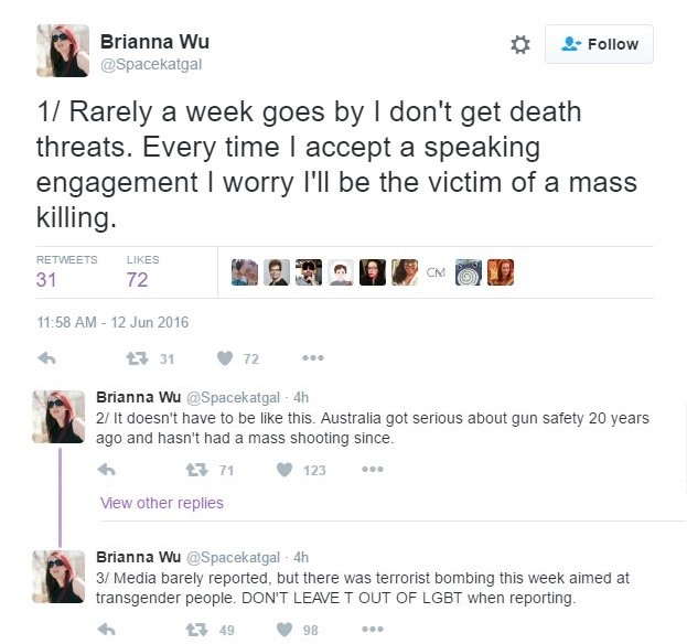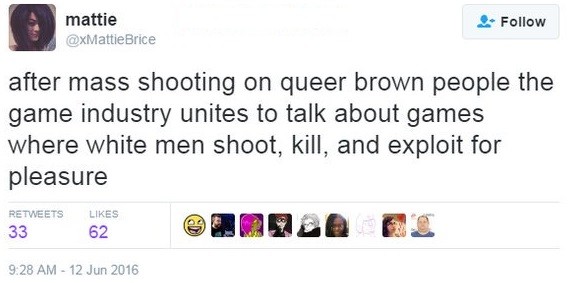 Wow, just wow. Not only does this girl… guy?… This thing make some major assumptions of the victims of this tragic shooting, but also makes some racist and sexist claims about gaming too. Yes, there were homosexual and transsexual people, some of them of colour, being killed in the shooting; but not all of them were brown, black or any other race. It was a mixture, and frankly, their sexual or racial identity no longer matters. A victim of death is a victim no matter what.