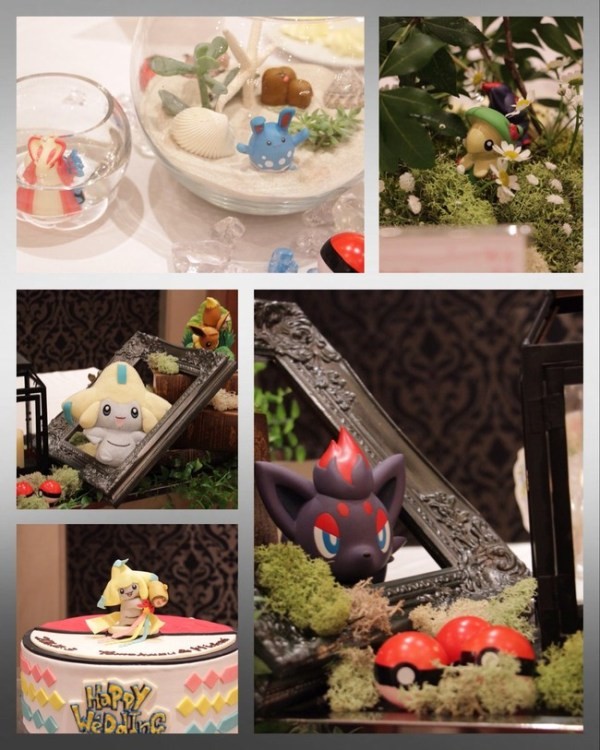 As shown by Anime News Network, Scattered through the wedding area were dozens of Pokemon figurines, some even showing them off in their “natural habitat”. It went further though as customized Pokemon style art of the two as Avatars getting married was also shown. To top that off, a custom logo for Pokemon HW (aka Pokemon Happy Wedding) was made for the couple.