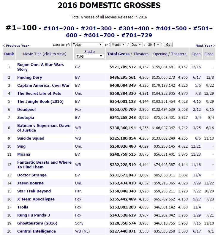 Image Source: 2016 Yearly Box Office Records – Box Office Mojo