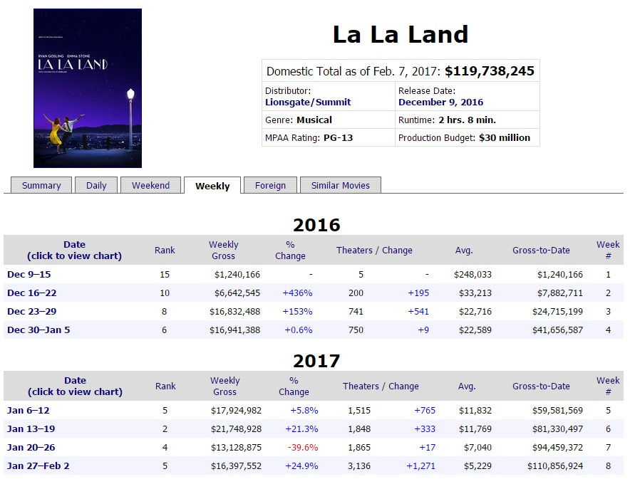 Now we can back this claim up with simple numbers. Thankfully in this digital age, people can get access to the box office records of any film for years after it releases. If you refer to the image above, you’ll notice huge increases for La La Land come on the weeks of Dec 23, 2016 through Jan 5, 2017; then again for Jan 13 through 19 & Jan 27 through Feb 2nd. Now the Golden Globe nominations came out in the third week the film was out and caused a 153% jump in sales, the following week when the awards were given out it didn’t do as good. The second jump comes at the post-holiday season when the movie was pushed hard with the Golden Globe branding attached to it, then again when the Oscar nominations came out. Each jump is sudden and is not consistent, meaning that there was an outside force pushing it’s growth.