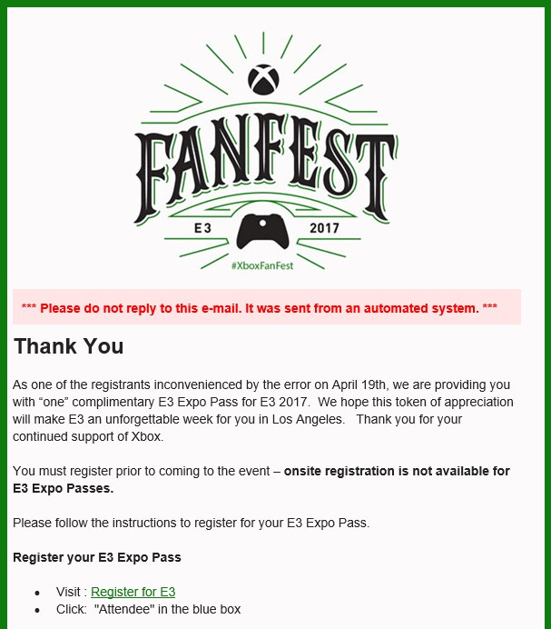 Previously Microsoft had voided the original ticket winners of their Xbox FanFest 2017 contest. Apparently, there was an issue with the system, and it gave out way more tickets than it was supposed to. Meaning everyone who originally won, including myself, was out of luck. Microsoft eventually made good on this and promised that everyone who originally won a ticket would be provided with an E3 2017 pass.