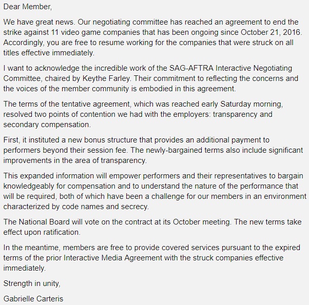 The SAG-AFTRA strike against video game developers which has been going on for quite a while now, also known as the #PerformanceMatters protest, has been ended by the Union after it came to an agreement with Video Game Industry bodies on September 23, 2017. The SAG-AFTRA Union released the following statement to their members on September 25, 2017, 7:09pm: