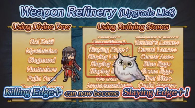 An added feature they showed off is Weapon Refinery. Now you are able to upgrade your weapons to have added perks and stat boosts. This is at the cost of SP, and new materials of Arena Medals and Refining Stones. These can be earned via Arena and daily quests. For basic weapons like Killing Edge, it can now evolve into a Slaying Edge. For some unique weapons, like Sol Kati or Siegmund, they will require a special material called Divine Dew. This can be obtained when you use refining stones on common weapons. Get ready to improve those units cause they have become more valuable now.