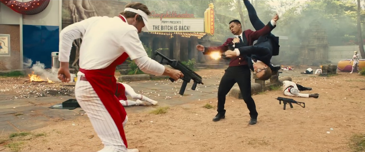The one thing that makes Kingman: The Golden Circle different is exactly what makes it a pain to sit through: Americanism. For a movie that originally was the re-imagining of the classic British spy movie, having all the British-ness removed from the movie and having it replaced by ‘Murica! is really jarring. Kingsman: The Golden Circle even goes as far as taking one of the best scenes from Kingsman: The Secret Service, the bar fight, and remakes it with one of the Kingsman being able to do nothing, leaving it to one of the Statesman to come in and do the whole scene over in the over the top American style, complete with lasso. To me this was a slap in the face to everything that made Kingsman: The Secret Service such a great film to watch. If anything, there is so much ‘Murica! in Kingsman: The Golden Circle that it makes me wonder why they used the Kingsman name in the first place (with exception of branding of course).