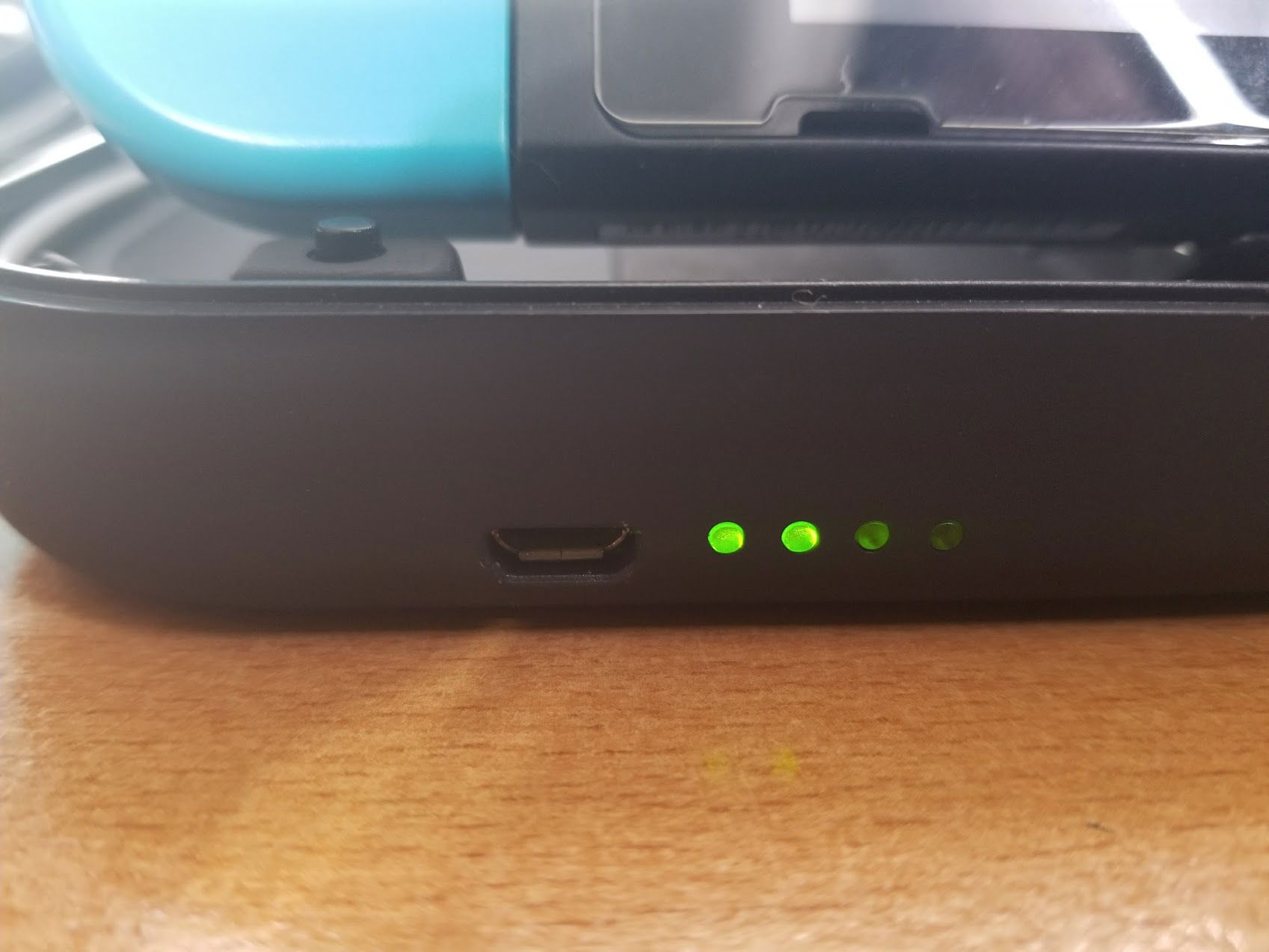 On the bottom-left side of the case are 4 LED lights that glow when the case is being charged. Each LED represents a 25% charge. To the right of that is a micro-USB port. This is where the case gets charged from. And oddly enough, the Power Shell Case does include a micro-USB cable, it doesn’t include an AC adaptor. You’ll have to either plug it an AC adaptor you already own, the Nintendo Switch dock or go purchase one. It’s worth mentioning that a computer/Laptop can also charge the case – just pointing that out.