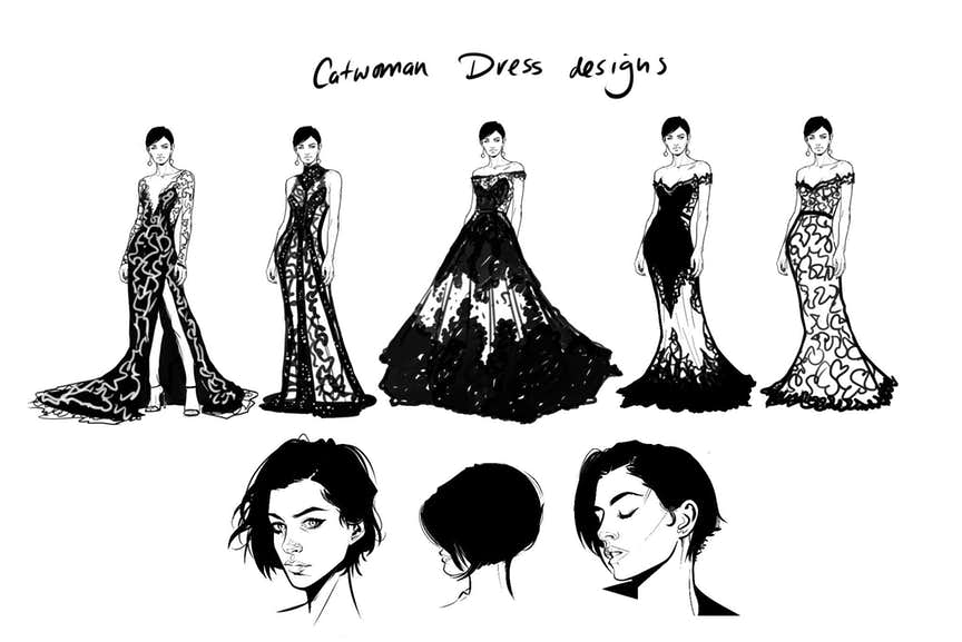 DC Comics has also revealed some of the unused preliminary designs, drawn by artist Joelle Jones. The image features five gorgeous gowns, with the second-to-last being the one that appears on the final cover. Then, beneath those designs, Jones toys around with several different hairstyles, each presented from a slightly different perspective.