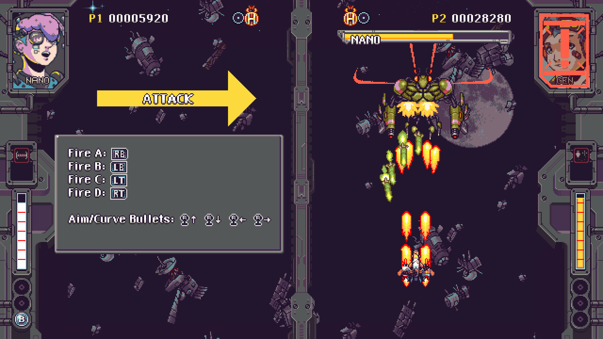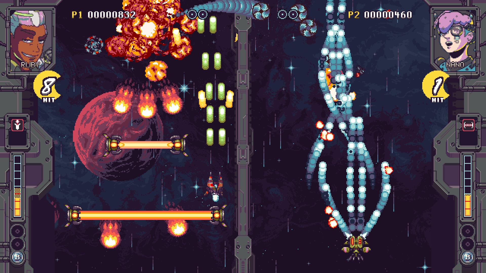 I idea is definitely an interesting one. Though, I don’t think I’ve ever wanted to toss a bomb or a squad of enemies at my co-op partner. At least not in a Shmup. We’ll have to wait and see how this plays out.
