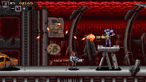 The game plays just as one would expect a Contra meets Metal Slug game would. You have your standard attack that does decent damage. Along the way, you’ll pick up new weapons and will be able to hold up to three additional weapons. You can switch between those weapons at any time. There’s also a melee weapon which will be used if an enemy gets in to close or if you want to rush in for some high risk but greater damage. I used this tactic when fighting a few of the bosses. While I couldn’t tell if it did more damage than using the ranged weapons, it was damned fun trying it out.