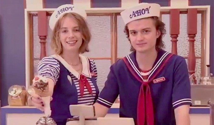 This new Starcourt mall has lots of fun little details. The grainy video footage and cheesy music really capture the 1980s. We see a few brands that have long beed dead like Sam Goody and Walden Books, which is sure to bring back some fond memories for us mallrats. But the biggest thing about the trailer is that everyone’s favorite team mom, Steve Harrington, is working for minimum wage at one of the mall’s stores, an ice cream parlor called Scoops Ahoy. Oh how the mighty have fallen.