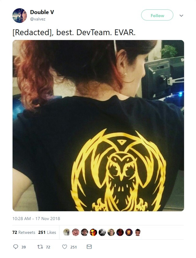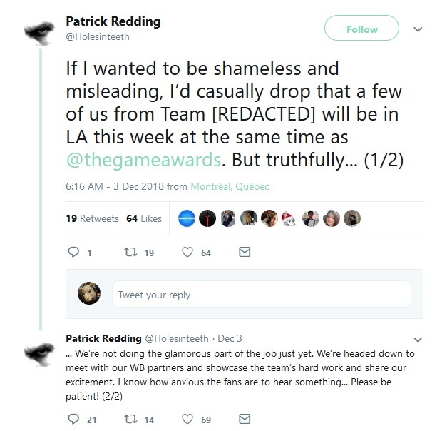 Earlier this week, WB Montreal announced that they wouldn’t be at The Game Awards. But that hasn’t stopped them from teasing what they’re working on. The Studio’s Assistant Producer, Valerie Vezina tweeted out an image of an owl along with ‘REDACTED, best DevTEAM EVAR’.