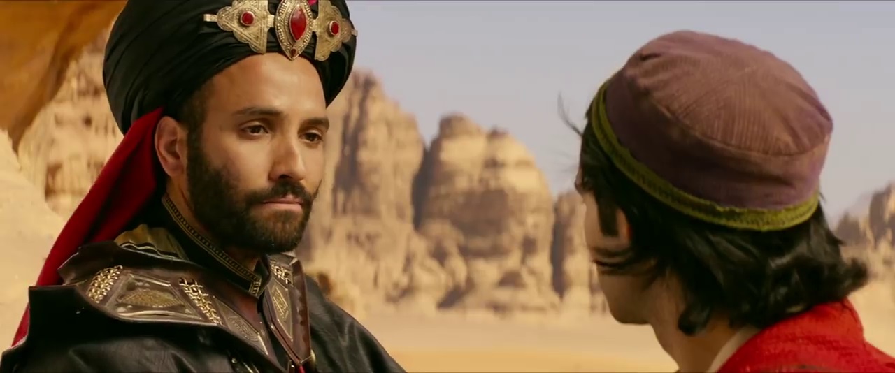 Out of all the characters, settings and story points that got changed and added to in this version of Aladdin, it was Jafar who got the most work. While he doesn’t have the outright sinister bad guy look that the animated version did, it’s more about the character than the look. In this version we learn that Jafar was a street thief like Aladdin, but instead of just stealing enough to survive he took all that he wanted in order to change his station in life from thief to Vizier, using his own personal mottos of “If you steal an apple, you’re a thief. If you steal a country, then you’re a Statesman” and “If you’re not the most powerful man in the room, then you’re nothing.” It’s these mottos that drive Jafar as a villain and gives him more motivation and purpose than just “evil for evil’s sake.” Kenzari’s more sly and controlled (with the occasional outburst when someone calls him “second place”) demeanor of Jafar makes him much more of a threat than the cartoon and also a counter point to Aladdin’s more down to Earth ideals.
