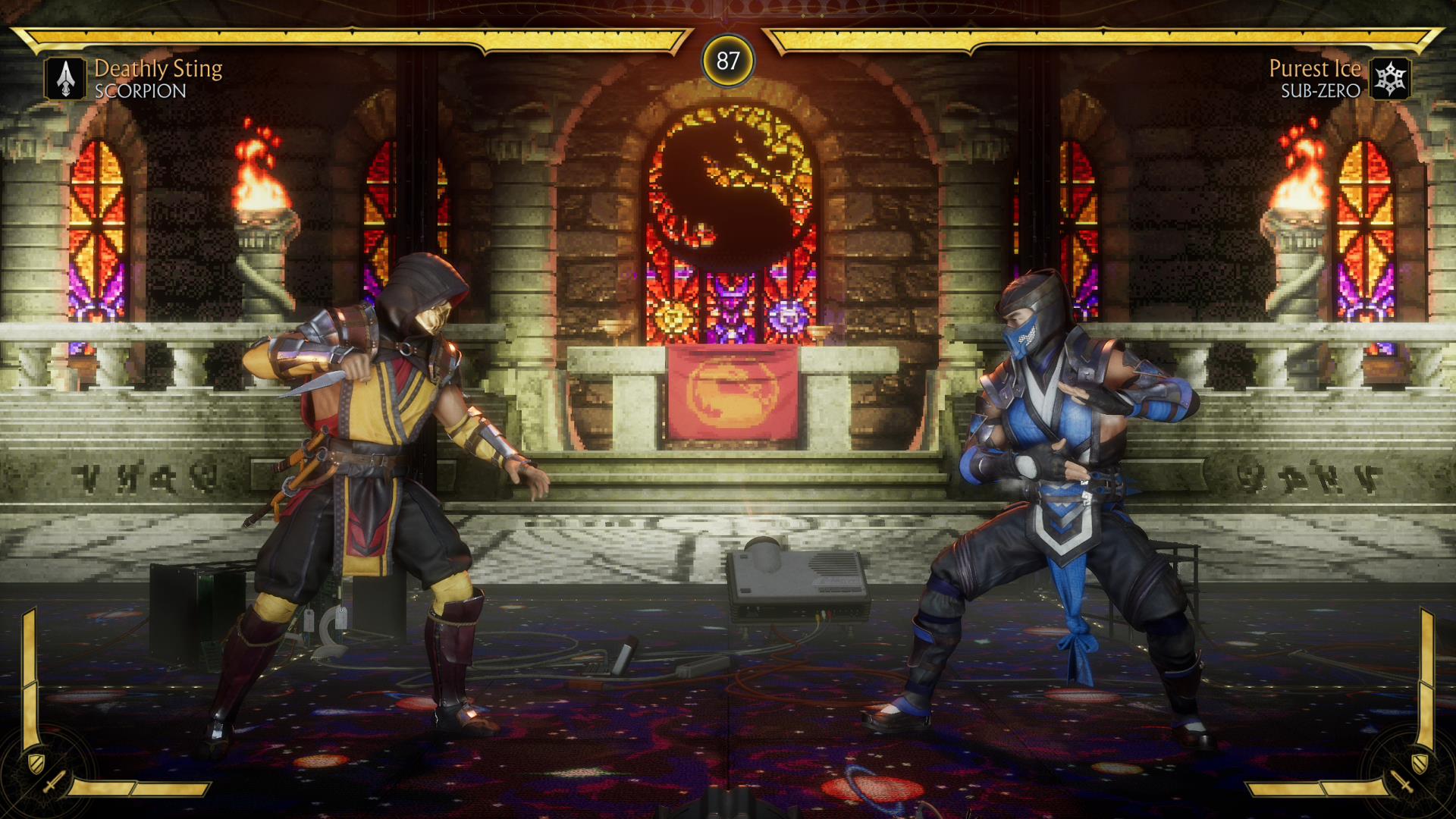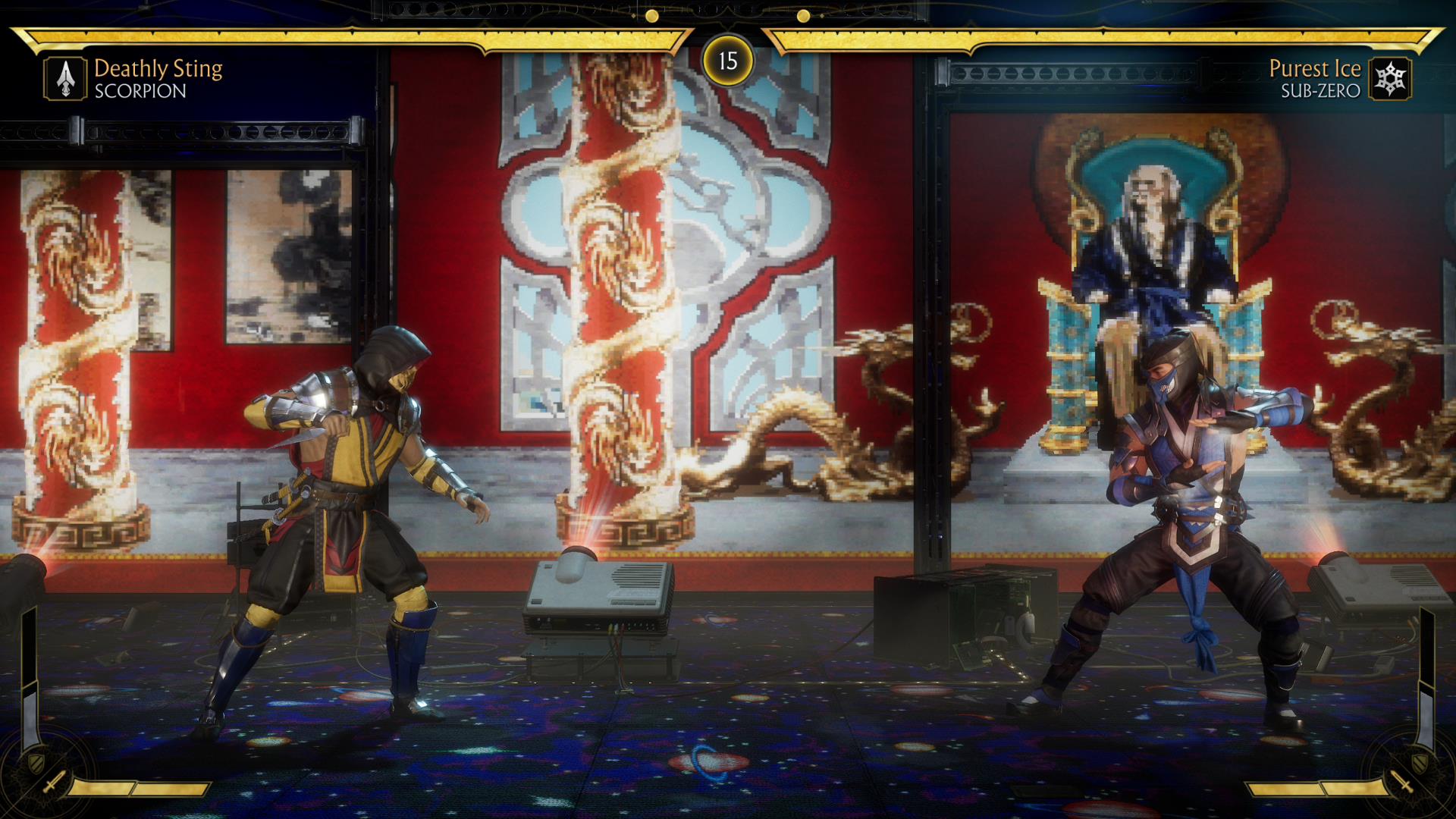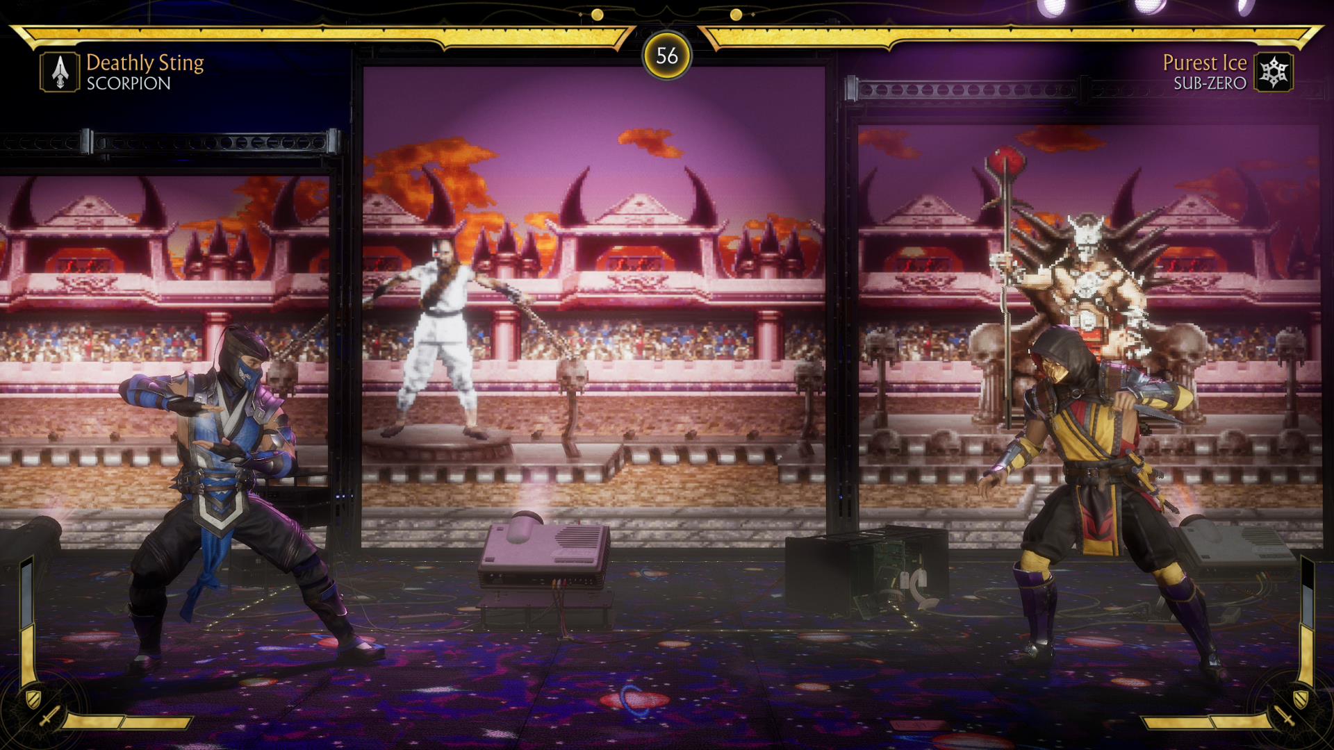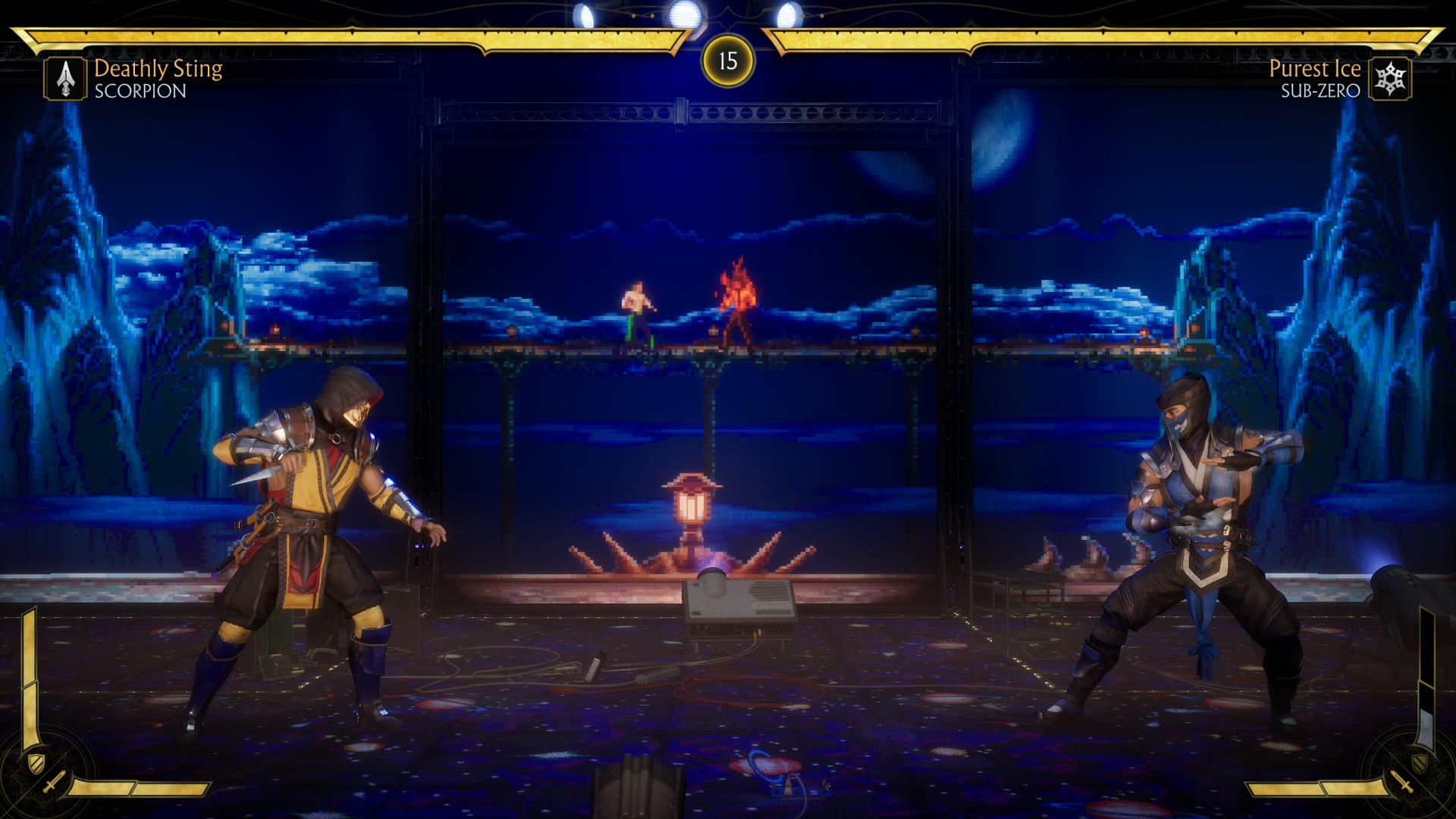 Throughout the fight, classical Mortal Kombat music is played, and several stages from Mortal Kombat 1-3 are projected onto five large screens. Players can interact with the projector to change the backgrounds. While older Midway arcade games such as Grid, Primal, Defender, Rage, Joust, and a few other surprises that I won’t spoil are featured throughout the stage. This is truly one of my favorite fighting stages from now on.