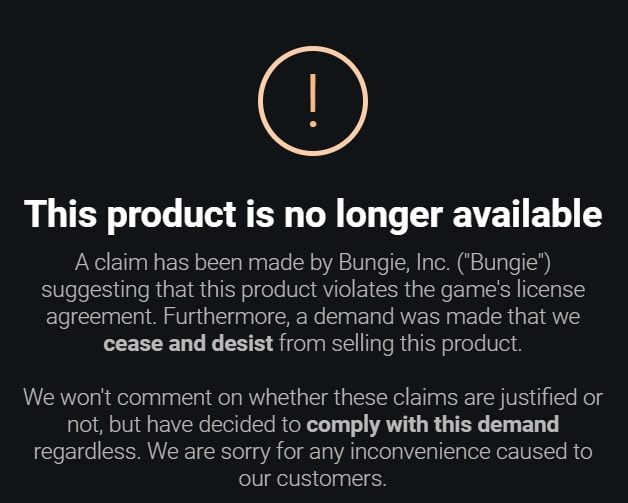 A claim has been made by Bungie, Inc. (“Bungie”) suggesting that this product violates the game’s license agreement. Furthermore, a demand was made that we cease and desist from selling this product.