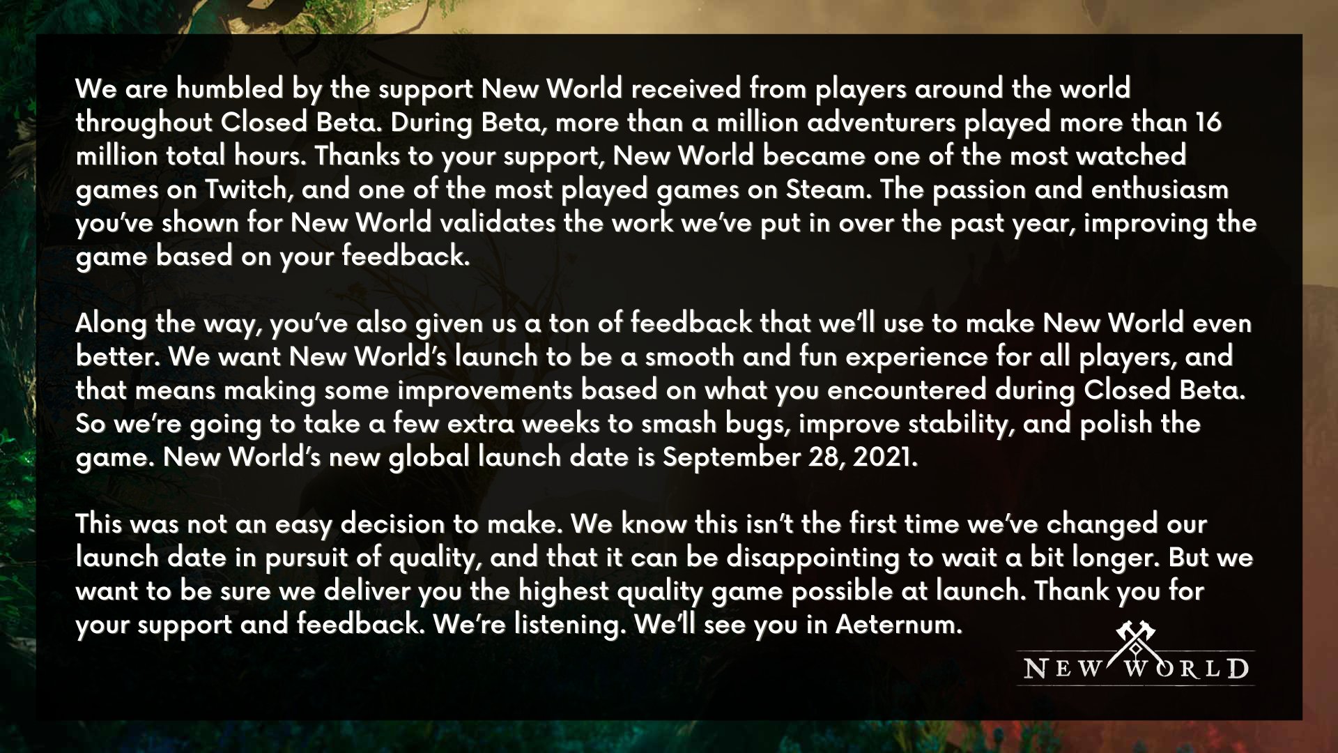 Amazon’s New World has been delayed until September 28th, 2021, and is only being released for the PC.