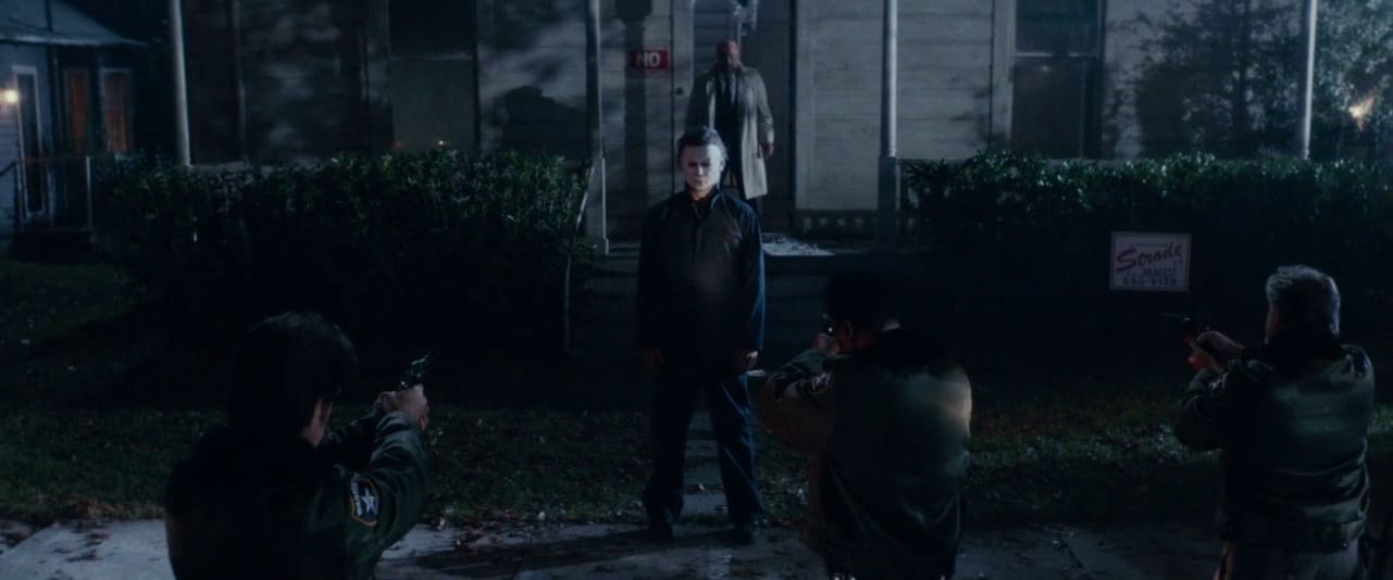 Back at the Myers house, Lonnie arms himself and heads in alone until Allyson and Cameron hear gunshots and rush inside to help him. They discover the bodies of Big John, Little John, and Lonnie before being attacked by Michael. In the ensuing fight, Michael breaks Allyson’s legs by shoving her down the stairs and brutally beats Cameron before snapping his neck. As Michael prepares to kill Allyson, Karen stabs him in the back with a pitchfork, steals his mask, and taunts him to follow her. Karen lures Michael into the path of Tommy’s mob. Michael recovers his mask before being attacked and seemingly killed by the mob. As Karen leaves to reunite with Allyson, Brackett prepares to shoot Michael in the head. Michael recovers and manages to slaughter the entire mob, including Brackett and Tommy. Back at the Myers’s house as Allyson receives medical attention, Karen sees a young Michael looking out the bedroom window and investigates. Michael appears and stabs her to death. Laurie stares out of her hospital room window while Michael stares out his window.