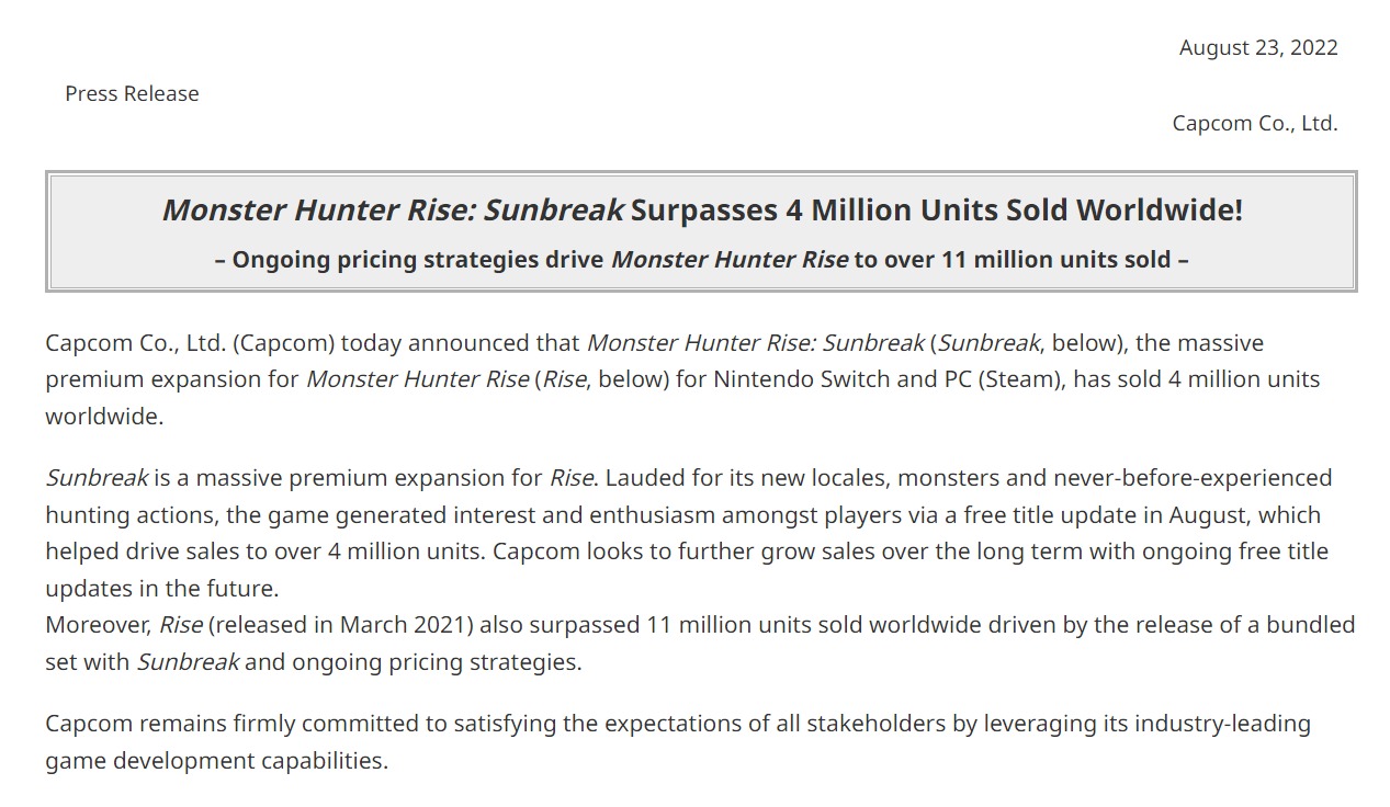 This comes in a recent press release from Capcom, also announcing that the base game of Monster Hunter Rise has crossed over 11 million units.Monster Hunter RIse: Sunbreak