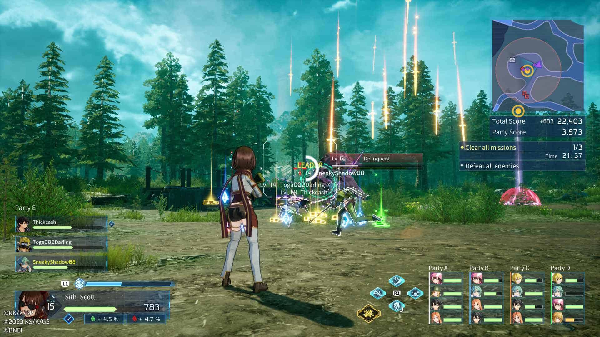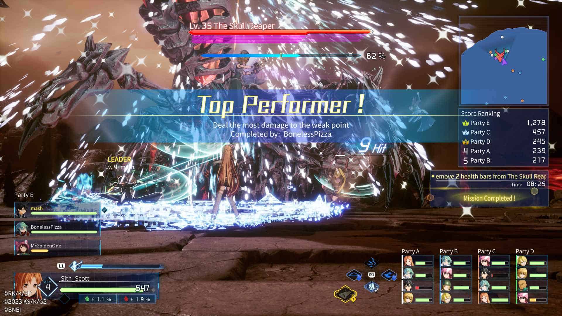A portal opens up and takes you to a boss. For this demo, the boss was a familiar one to those who are fans of the Sword Art Online series, Illfang The Kobold Lord. Your goal is to land the last hit on the boss to get a big boost to your score. The player who gets the last hit will get a focus on their character right as the boss dies. This is also a fun incentive. The final bit of the level ends with a reveal of which party had the highest score.