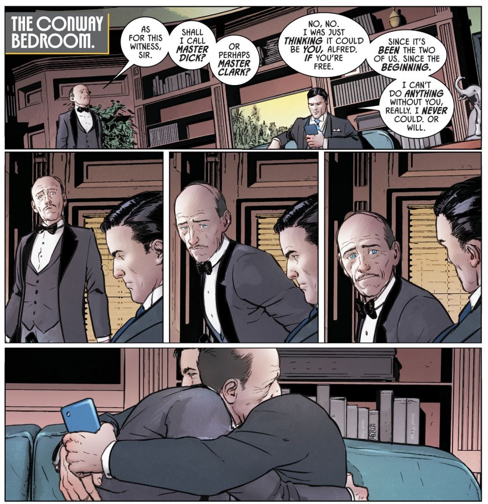 King’s writing here is some of the best that he has produced ever. There is nothing but emotion in every page thanks to the art from so many artists in Batman’s history combined with his words. There are moments that will bring readers to tears, especially the moment between Bruce and Alfred that I posted above. However, it is all tarnished, betrayed because of that all important rule: Batman cannot be happy… EVER!