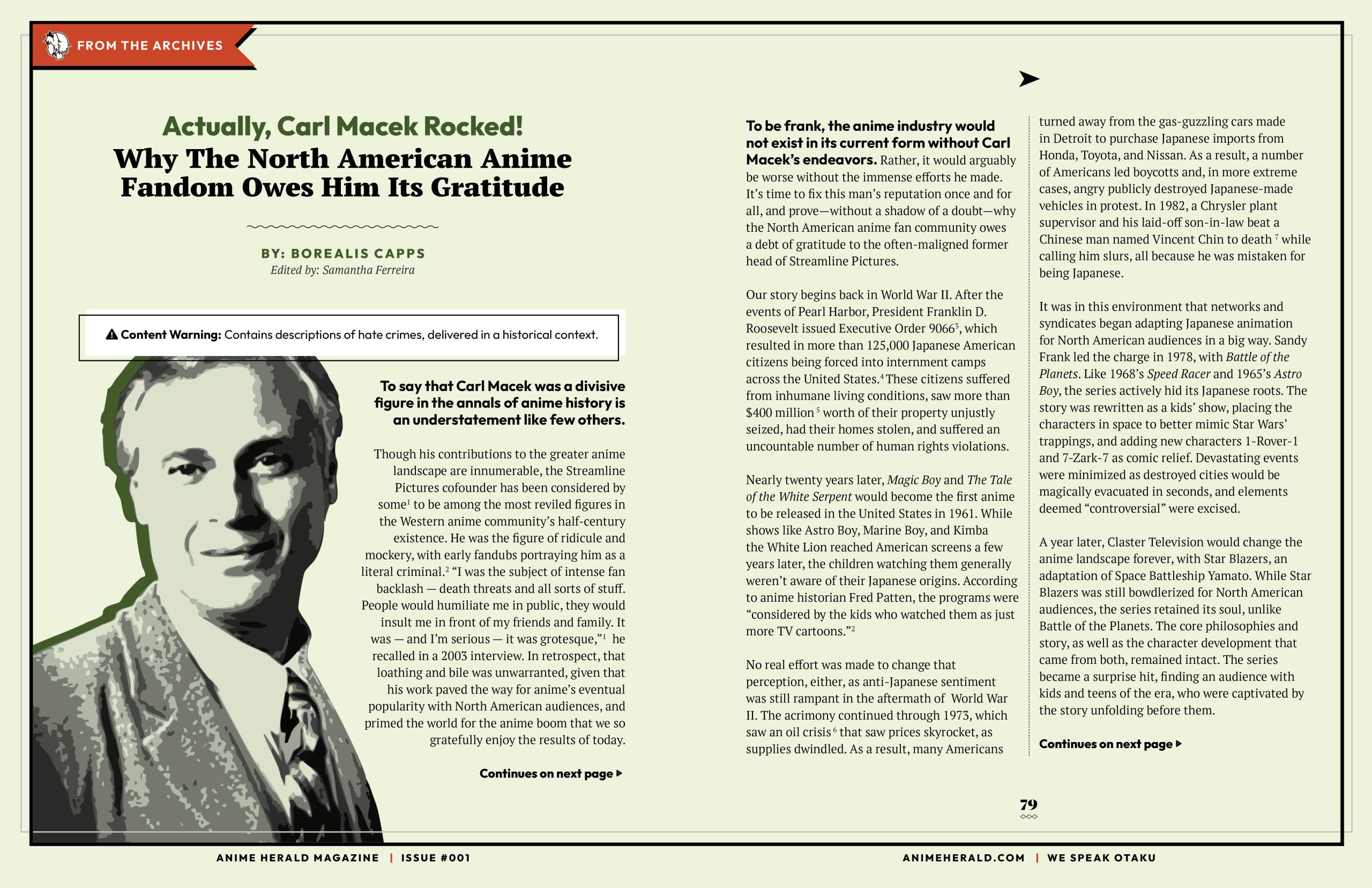 We dive into the second interview in this issue as Samantha Ferreira talks with Helen McCarty, who was the founding member of the U.K.’s anime community. The interview gets her thoughts on what she felt was the biggest change since joining the anime community, her journey to writing The Anime Encyclopedia (to which I own a copy of, by the way, and it is one of the prized possessions in my anime collection!), to her time running Anime UK, and more! It was another insightful interview from one of the pioneers of our community!
