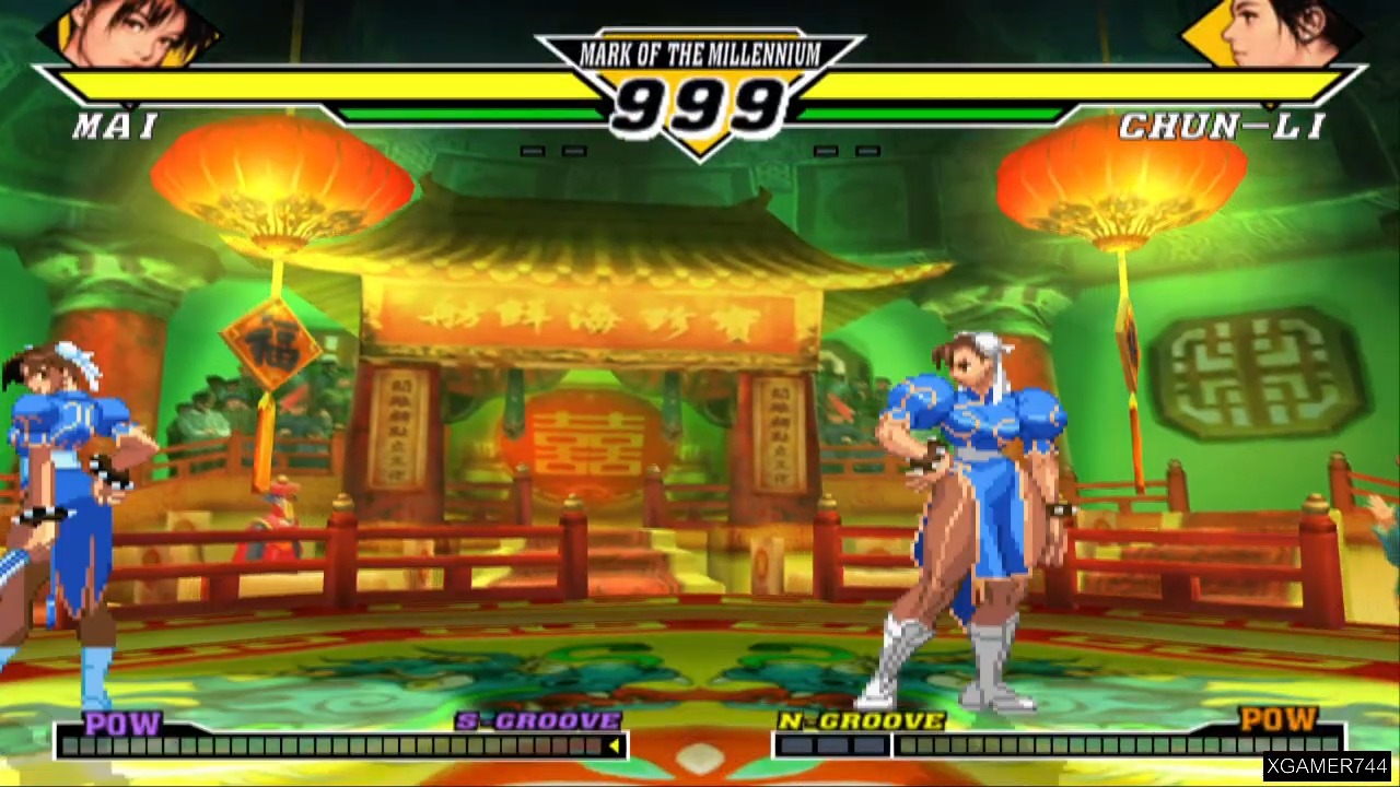 The two iconic female fighters square off, bringing the cool flow and heat along with them. There are nods to their Capcom vs SNK intro such as Mai Shiranui mimicking Chun-Li’s attire. If you couldn’t tell who who at first glance was – we don’t blame you. The backdrop may also look similar to a certain Third Strike background that is used during Sean’s bonus game. SNK nods strike again.