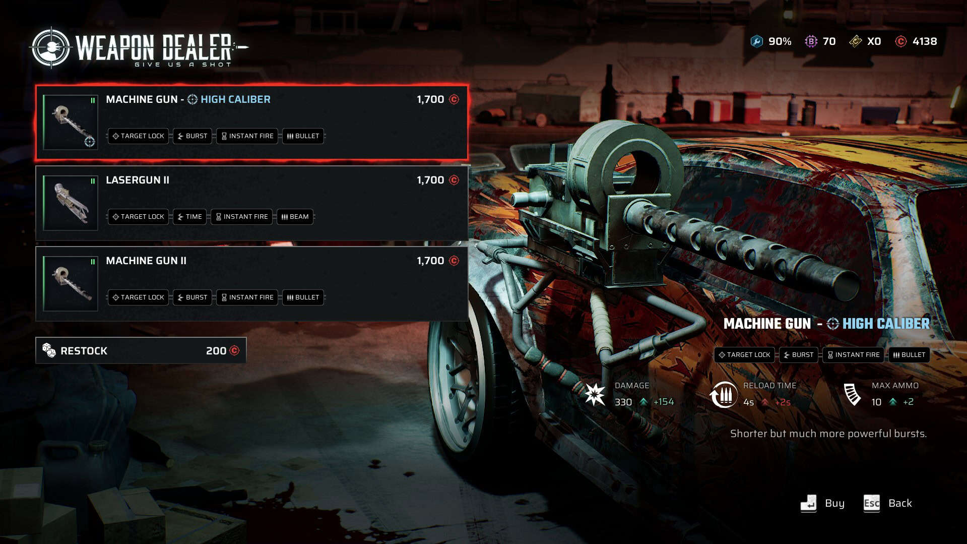 Other weapons, such as the shotgun, can have multiple ammos stockpiled for continuous firing. Ammo is picked up along the track or dropped by enemy racers whenever you wreck them. Shops can swap out your weapons for another one if you don’t like the default, but those options only become available once you permanently unlock those weapons using Beatcoins after every run.