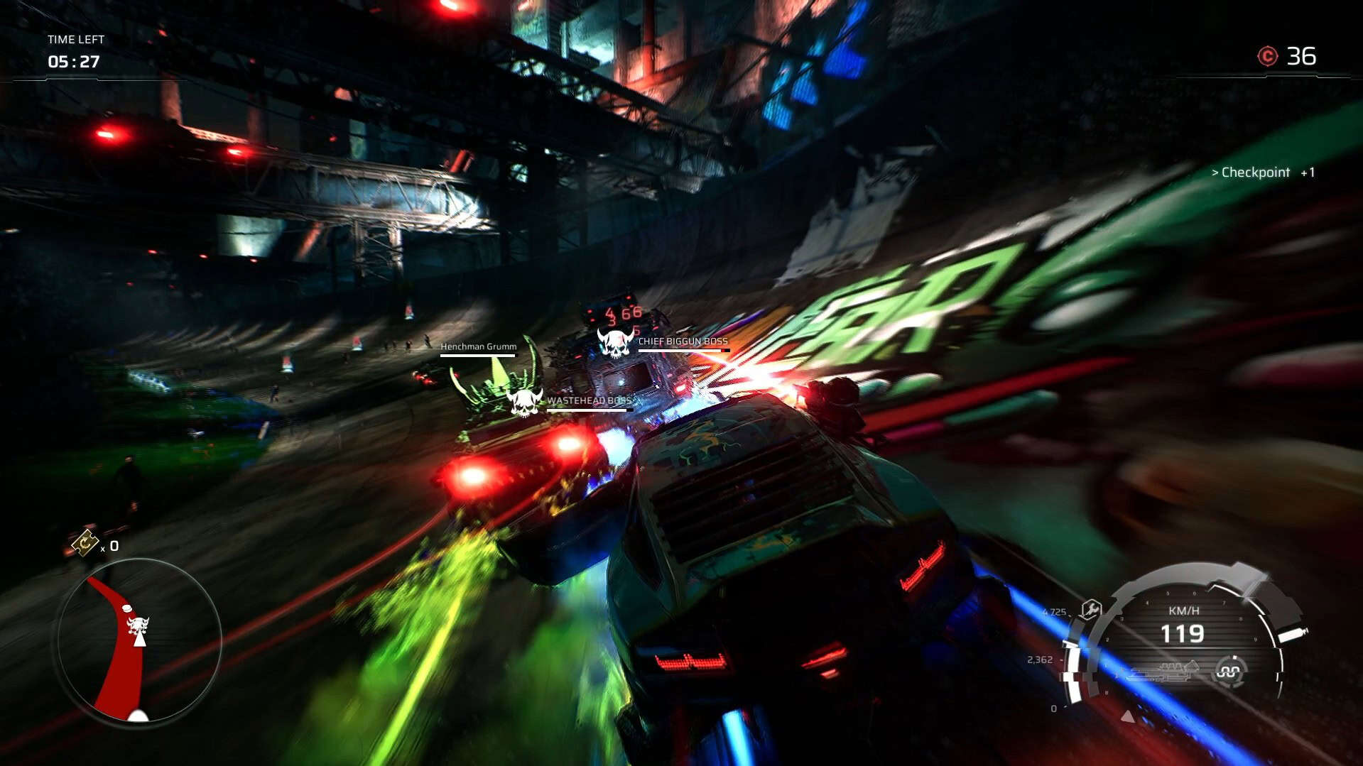 After you progress far enough, the focus shifts to a boss fight. Here, you need to take down one or several boss-level racers. Here, you don’t have to worry about placing first, second, or third in a race because there is no finish line. Instead, it’s a race against the timer as you have a certain amount of time to kill the boss, or you automatically lose. The boss fights so far have been fun and challenging, as they have you dodging mechanics such as getting rammed, rockets, bombs, exploding barrels, and more.