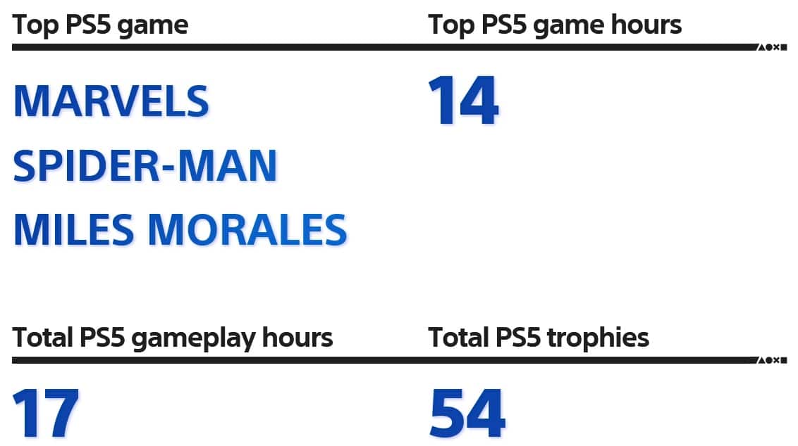 Unsurprisingly, since this was my Game of The Year for 2020, seeing Marvels Spider-Man: Miles Morales as my most played PlayStation 5 game is pretty cool. Also seeing that I’ve played 17 hours of games on the console isn’t too bad either. What does surprise me though is the 54 trophies gained on the PlayStation 5. I’m not too sure if that’s counting PlayStation 4 games in that total or just PlayStation 5 games. There is no breakdown for this, nor is there any explanation.