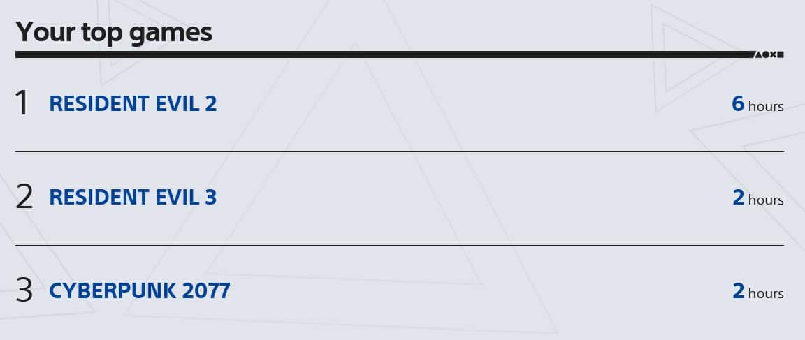 Next is the Top 3 games you would have played in 2020. This again I would contest since I know I played Resident Evil 2 & Resident Evil 3 a lot more than this in 2020. By this stage, I’m thinking it took only my PS5 playtime into account as I’m sure I spent more time on the PS4 before getting the PS5 when it was released. Also, what the fuck is Cyberpunk 2077 doing on there? Did I really waste 2 hours on this thing? I swear it felt longer than that.