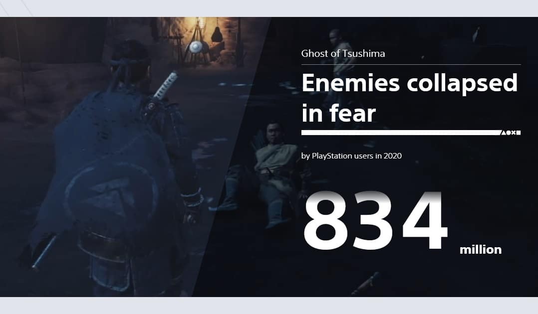 Of course, we do need to promote Sony games in this thing. So here’s the first more general statistic that you will be presented with during your look back at 2020. It seems that Ghost of Tsushima did really well in making enemies fall to the ground in fear of your character with over 834 million NPCs brought to their knees in 2020.