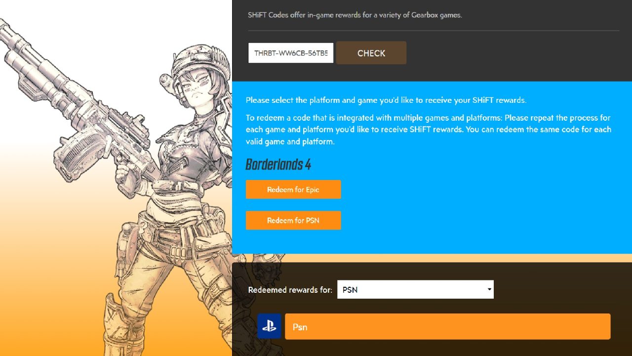 To be able to even use Golden Keys in Borderlands 4, you’ll first need to create a SHIFT account. This is what connects to your profile online to unlock items in the game. Once you’ve connected your gaming account (Steam, PlayStation Network, etc) to the SHIFT account, use the website and click on the “Rewards” section. You’ll want to use the website as the code is lengthy and is a pain to input on a PS5, Xbox Series X|S, or Nintendo Switch 2. On PC, you’d likely be able to copy and paste, thankfully. Redeem the code and make sure to pick the right platform.