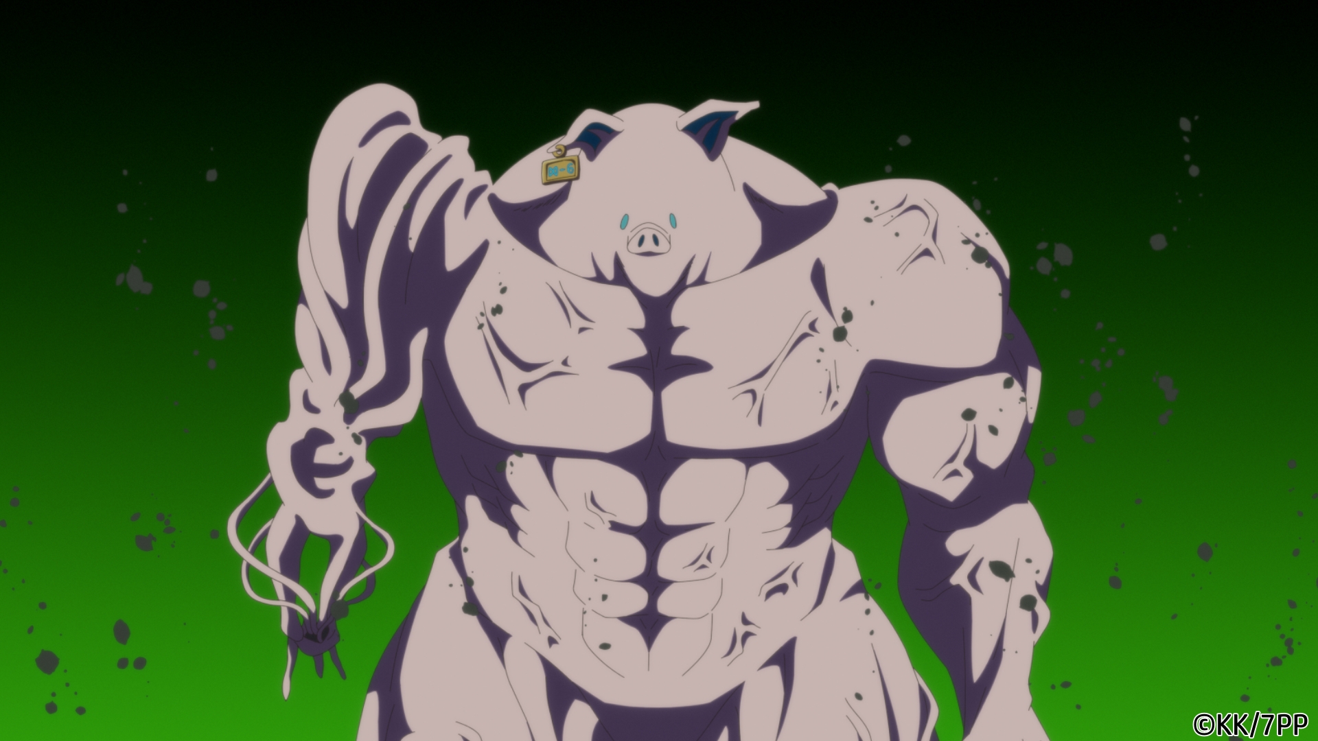 Babylon’s group are in a predicament as they battle the pig chimera called Mega Meat that regenerates and hardens every time it’s struck down. Meanwhile, an unarmed Sylpha is in a touch-and-go confrontation with the Grand Priestess Anastasia. Both are unwilling to cede a single step due to their devotion to their respective masters… Sylpha is forced to pick up a candelabrum she finds at hand, while Anastasia’s sword rains down relentlessly.