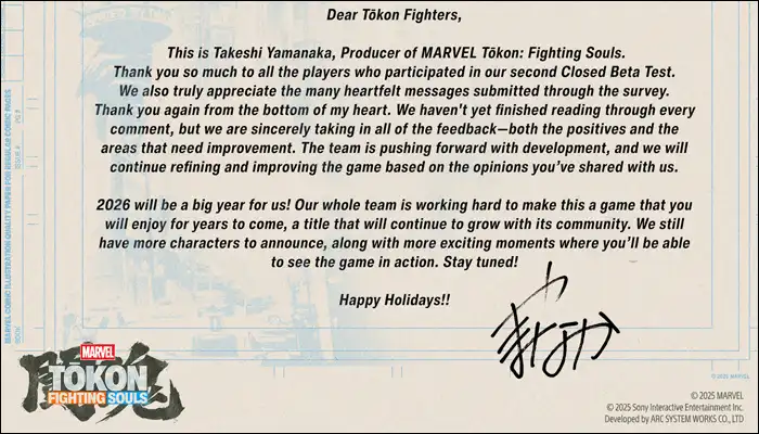 This is Takeshi Yamanaka, Producer of Marvel Tokon: Fighting Souls. Thank you so much to all the players who participated in our second Closed Beta Test.