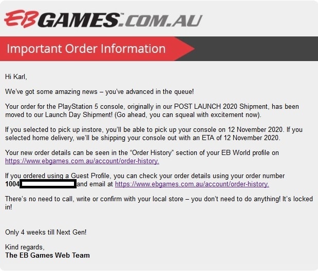 What I wasn’t expecting was to be checking my email after dinner that night and receiving two emails, both titled “Update to the status of your Playstation 5 preorder” from EB Games. The first thing in my mind was: “Fuck! No Playstation 5 till sometime in 2021. Thank god I’ve got an Xbox Series X at least”. But when I opened the email I was shocked to read that EB Games had bumped my preorder up from post-launch 2020 order to a launch day order! I was getting a Playstation 5 on launch day! So say I was shocked was an understatement… However, that shock and excitement were short-lived as news started hitting the news websites only an hour later that EB Games had a glitch in their system and people were getting upgrade emails that were soon made invalid, so I waited for mine to be revoked… And nothing showed up, but I was still worried.