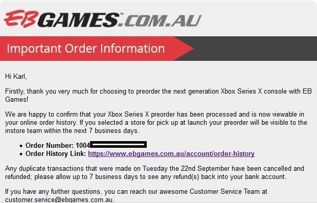 Just as I got back to bed, I decided to see if I could call the EB Games customer support line to see what the situation was when it came to people who had been charged for the Xbox Series X/S but not received a confirmation email. I was on hold for about an hour before getting a lovely lady in the customer support center who explained that due to the influx of people placing preorders that the system was overloaded and the tech people were working through a backlog of orders and confirming those manually with stock levels for each store and then confirming the preorders with customers. I was told that this will take a few hours and that they are giving priority to customers who have already been charged for the console first.