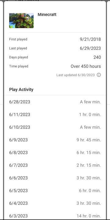 Click on a game and you can see a detailed log of how much time you spent on that game per day. It also tells you the first and last times you played that game, and your play history will include 3DS, Wii U, Switch, and Switch 2. Seriously, I had no idea that I was playing Minecraft for hours every single day more than two years ago, but it’s cool to look back on.