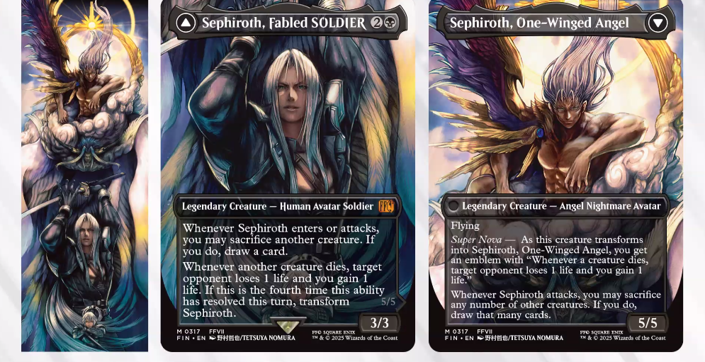 Final Fantasy VII is another beloved entry in the series, and arguably the most iconic. As such, the set features another hallmark of the series: Chocobos! There are a variety of colors for this card, with the rare Gold Chocobo serialized as just one of 77. As the famous villain of Final Fantasy VII, Sephiroth features art by Tetsuya Nomura, the longtime designer for Final Fantasy.