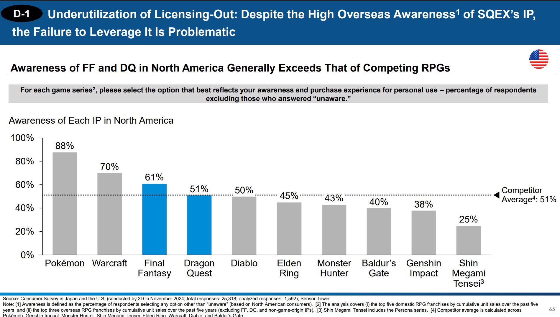 Rewinding a bit, one of Square Enix’s biggest investors is an “activist group” known as 3D Investment Partners, and they made a massive presentation with the goal of showing off what the publisher is doing wrong and how they can fix it. One of the slides in the presentation was how “aware” RPG gamers in the US are of their franchises: